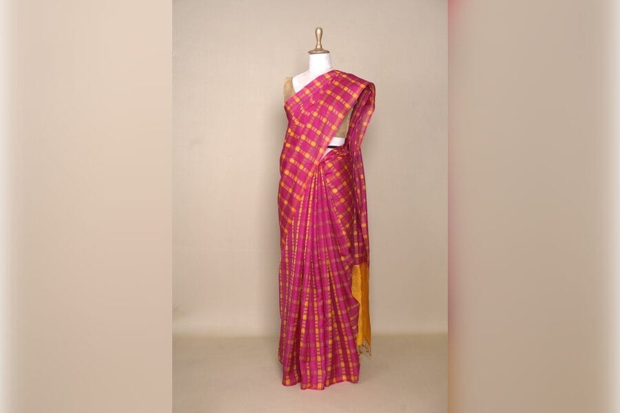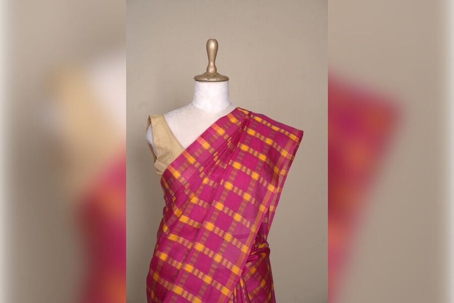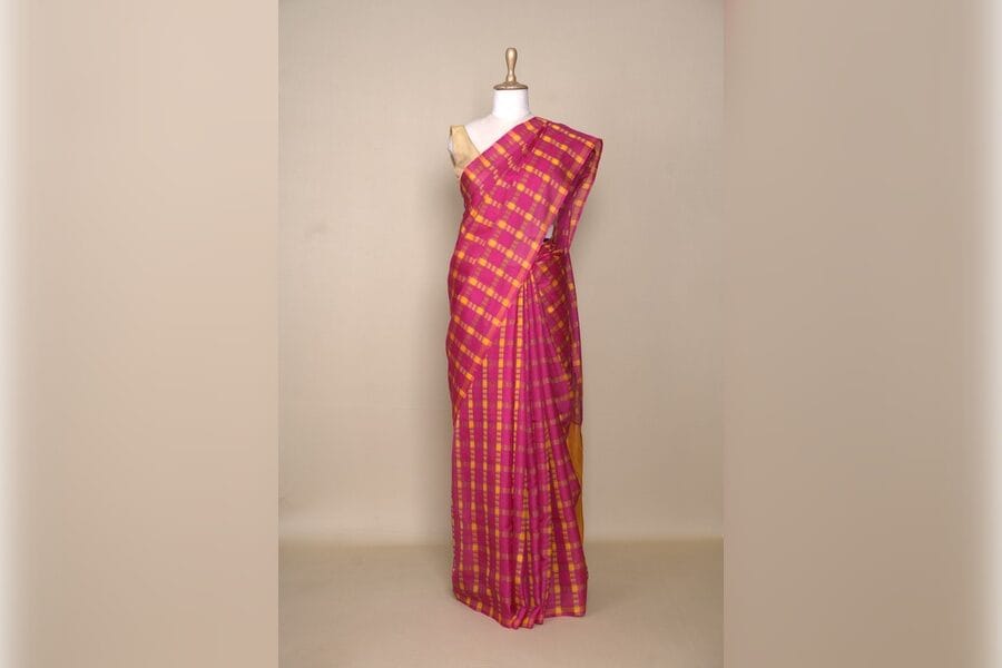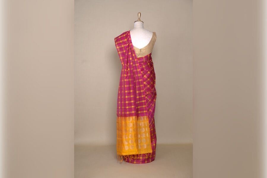 Pink Mustard Chex South Kora Silk Saree – House of Samaa